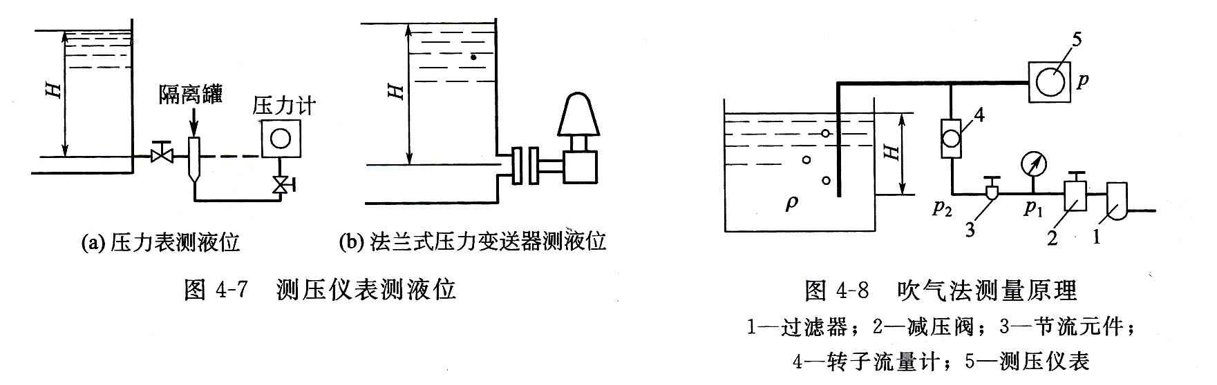 如圖4—7(a)所示。測壓儀表(壓力表或壓力變送器)通過引壓導管與容器底部相連,由測壓儀表的指示便可知道液位的高度。若需要信號遠傳,則可以采用傳感器或變送器進行壓力一電氣信號轉換。