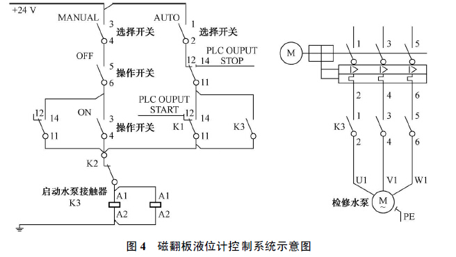 繼電器K1 動作, 接點11 、14 接通, 此時水泵已在自動位, 選擇開關接點1 、2 接通, 回路中K2 為PLC 脈沖輸出停泵繼電器, 沒有動作, 其接點11 、12常閉點閉合, 根據主回路可知, 啟動水泵接觸器K3動作, 主用水泵啟動。當水位繼續上升, 到達41 .1 m 或41 .2 m時備用泵隨之啟動, 如需必要可以再手動啟動1 號、2 號檢修水泵。相反, 水位下降后, 到達水位點40 .5 m 時, 輸出脈沖觸發繼電器K2停止水泵運行。