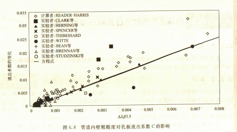 圖中所列的數據僅僅表明研究者對孔板做過這方面的研究,而不表明僅僅孔板有此影響。有的人吹噓說某種新型差壓裝置不像孔板那樣受雷諾數影響,不受管道內壁粗糙度影響,那是不確切的。所有管壁取壓的差壓裝置都要受到雷諾數的影響和管壁粗糙度的影響。
