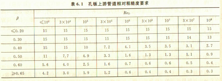 表6.1列出了孔板流量計上游管道相對粗糙度的上限值,單位是10'Ra/D,其中,Ra為偏離被測輪廓平均線的算術平均偏差。