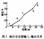 在一定工況下,被測介質(zhì)及其密度是不變的。它們對液位測量沒有影響。從表1中可以看出,一效至五效加熱坡度逐漸降低,**壓力逐漸減小。為了測定壓力、溫度對變送器產(chǎn)生的影響,在設(shè)備檢修是,對液位變送器進(jìn)行以下實驗。 1)對新拆下來的液位變送器在量程范圍內(nèi),采用精密數(shù)字壓力計進(jìn)行標(biāo)定,標(biāo)定結(jié)果顯示:變送器零點產(chǎn)生漂移,線性變壞。變送器輸入、輸出關(guān)系見圖2.
