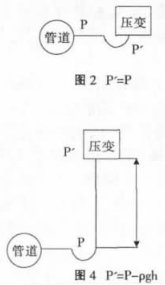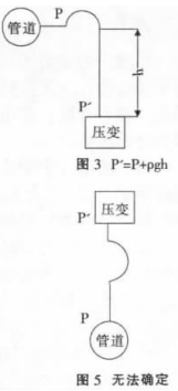 建議采用圖2的安裝方式,如不得已需要選擇圖3、圖4的安裝方式一定要對壓力進行補償。不建議按照圖5的方式安裝,因為無法確定P'與P的關系。