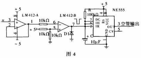 為了排除以上干擾,設(shè)計了一個檢測電路(見圖4)。整個檢測電路由跟隨器、比較器、定時器組成。跟隨器的作用是將檢測電路與儀表的其他電路隔離,防止檢測電路對信號u產(chǎn)生影響。比較器電路的正向輸入端接2.5V的電壓,當傳感器管路不是空管時,由于信號u,ZUI大值不超過0.5V,所以比較器的輸出始終為高電平;當傳感器管路為空管時,比較器輸出一序列的方波信號。二極管D1為方波信號的負電壓提供回路。由NE555構(gòu)成的通用定時器電路的工作原理是:當輸入觸發(fā)信號電平低于電源電壓的1/3時,內(nèi)部比較器開始工作,觸發(fā)電路觸發(fā),內(nèi)部的放電晶體管斷開,電容C被充電。充電電壓超過電源電壓的2/3時,內(nèi)部比較器再次工作,放電晶體管把電容C中積蓄的電荷放掉,然后等待下次觸發(fā),輸出脈沖寬度由T=1.1×C×R確定,脈沖寬度ZUI長可達數(shù)十秒。