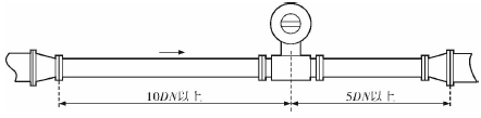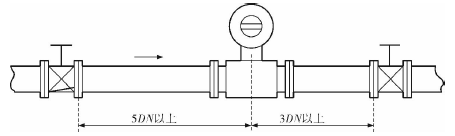 電磁流量計的安裝質量對其測量結果的影響較大,因此在安裝時需要注意幾個問題。*先,電磁流量計直管段的選擇在配管時一定要按照要求進行選擇,一般選擇流量計通徑與工藝管道通徑相同,即可滿足工程需要,而且安裝方便、壓力損失小,流量計直管段上游側的長度不少于5倍工藝管道直徑,下游側的長度不少于3倍工藝管道直徑(圖2)。但在流速太慢而又要求精度較高或需要變徑的應用場合,可選擇通徑小于工藝管道通徑的流量計,以提高測量精度,此時流量計上、下游必須加裝異徑管,且進口異徑管上游側應有長于10倍工藝管道直徑的直管段,下游側應有長于5倍工藝管道直徑的直管段(圖3)。