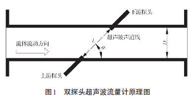 本研究針對一款雙探頭時(shí)差法超聲波流量計(jì)。時(shí)差法是利用聲脈沖波在流體中順向與逆向傳播的時(shí)間差來測量流體流速。雙探頭超聲波流量計(jì)原理圖如圖1所示。