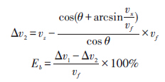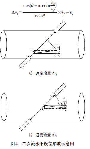 二次流水平速度(X 方向的分速度)直接影響了超聲波流量計(jì)的軸向檢測平面,對檢測造成了非常大的影響。聲道線在空間上先后收到方向相反的二次流水平速度的作用,這在很大程度上削弱了誤差。但反向速度并不完全相等,且超聲波流量計(jì)是按固定角度進(jìn)行速度折算的,超聲波傳播速度vs 對應(yīng)地固定為軸向流速為vd ,而其真實(shí)流速為vf ,由此二次流徑向兩個(gè)相反的水平速度,分別導(dǎo)致了Δv1(如圖4(a)所示)和Δv2(如圖4(b)所示)兩個(gè)速度變化量,其中Δv1 導(dǎo)致測得的流速偏大,Δv2 導(dǎo)致測得的流速偏小,兩個(gè)誤差不能抵消,產(chǎn)生二次流的水平誤差Eb :