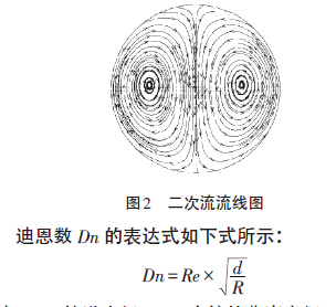流體流經(jīng)彎管,管內(nèi)流體受到離心力和粘性力相互作用,在管道徑向截面上形成一對反向?qū)ΨQ渦旋如圖2所示,稱為彎管二次流。有一無量綱數(shù),迪恩數(shù)Dn 可用來表示彎管二次流的強(qiáng)度。當(dāng)管道模型固定時(shí),迪恩數(shù)Dn 只與雷諾數(shù)Re 有關(guān)。研究發(fā)現(xiàn),流速越大,產(chǎn)生的二次流強(qiáng)度越大,隨著流動的發(fā)展二次流逐漸減弱。