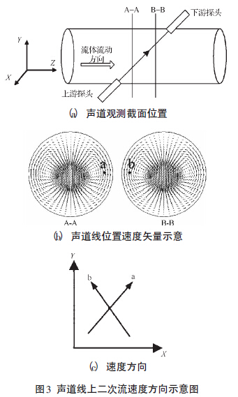 式中:d —管道直徑,R —彎管的曲率半徑。彎管下游形成的二次流在徑向平面的流動,產(chǎn)生了彎管二次流的垂直誤差和水平誤差。聲道線上二次流速度方向示意圖如圖3所示。本研究在聲道線路徑上取兩個(gè)觀察面A和B,如圖3(a)所示;聲道線穿過這兩個(gè)二次流面的位置為a和b,如圖3(b)所示。可見由于聲道線穿過截面上渦的位置不同,作用在聲道線上的二次流速度方向也不同,如圖3(c)所示。其中,徑向平面二次流速度在水平方向( X 方向)上的分速度,方向相反。