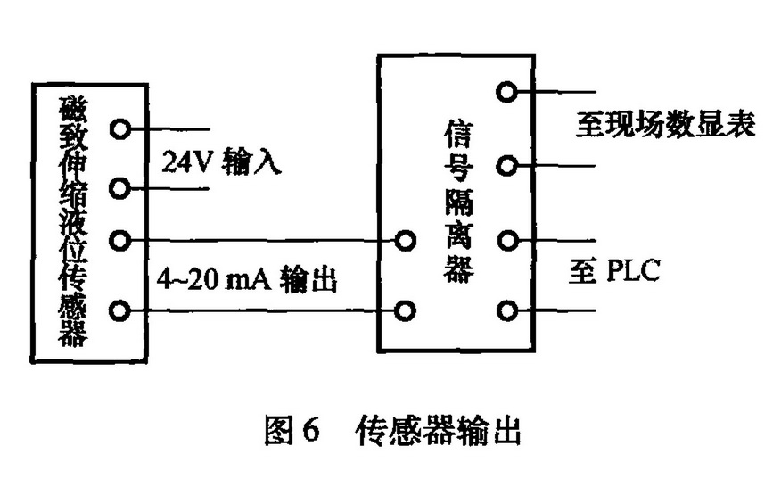 MTS的磁致伸縮式液位儀為法蘭安裝,貯罐罐頂已留有預(yù)留孔。安裝時(shí),調(diào)試過程簡單,只需通過調(diào)試測量頭上的智能型儀表,標(biāo)定上、下限液位數(shù)據(jù)后即可。輸出的標(biāo)準(zhǔn)信號4 ~ 20mA通過隔離光柵直接與PLC的模數(shù)轉(zhuǎn)換模塊相連。