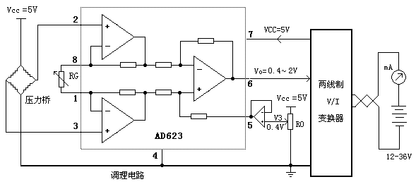 四、.兩線制壓力變送器設計 壓力橋、稱重傳感器輸出信號微弱,都屬于mV級信號。這一類小信號一般都要求用差動放大器對其進行*先級放大。一般選用低失調、低溫飄的差動放大器。另外在兩線制應用中,低功耗也是必需的。AD623是常用的低功耗精密差動放大器,常用在差分輸出前級的放大。 AD623失調大200uV,溫飄1uV/度,在一般壓力變送應用保證了精度足夠。 R0將0.4V疊加在AD623的REF腳(5腳)上,在壓力=0情況下通過調整R0使輸出4mA,再調整RG輸出20.00mA,完成校準。 電路設計時需注意,壓力橋傳感器相當于一個千歐級的電阻,耗電一般比較大。適當降低壓力橋的激勵電壓可以減小耗電電流。但是輸出幅度也隨之下降,需要提高AD623的增益。圖6給出的傳感器采用恒壓供電,實際應用中大部分半導體壓力傳感器需要恒流供電才能獲得較好的溫度特性,可以用一個運放構成恒流源為其提供激勵。