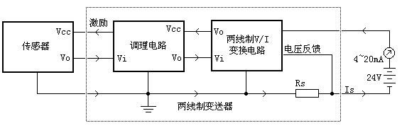 一、.兩線制變送器的結構與原理 兩線制變送器的原理是利用了4~20mA信號為自身提供電能。如果變送器自身耗電大于4mA,那么將不可能輸出下限4mA值。因此一般要求兩線制變送器自身耗電(包括傳感器在內的全部電路)不大于3.5mA。這是兩線制變送器的設計根本原則之一。 從整體結構上來看,兩線制變送器由三大部分組成:傳感器、調理電路、兩線制V/I變換器構成。傳感器將溫度、壓力等物理量轉化為電參量,調理電路將傳感器輸出的微弱或非線性的電信號進行放大、調理、轉化為線性的電壓輸出。兩線制V/I變換電路根據信號調理電路的輸出控制總體耗電電流;同時從環路上獲得電壓并穩壓,供調理電路和傳感器使用。 除了V/I變換電路之外,電路中每個部分都有其自身的耗電電流,兩線制變送器的核心設計思想是將所有的電流都包括在V/I變換的反饋環路內。如圖,采樣電阻Rs串聯在電路的低端,所有的電流都將通過Rs流回到電源負極。從Rs上取到的反饋信號,包含了所有電路的耗電。在兩線制變送器中,所有的電路總功耗不能大于3.5mA,因此電路的低功耗成為主要的設計難點。下面將逐一分析各個部分電路的原理與設計要點。