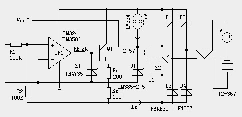 五、穩定性和安全性的考慮 工業環境下環境惡劣且對可靠性要求高,因此兩線制變送器的設計上需要考慮一定的保護和增強穩定性措施。 1.電源保護。 電源接反、超壓、浪涌是工業上常見的電源問題。電源接反是設備安裝接線時容易發生的錯誤,輸入口串一只二極管即可防止接反電源時損壞電路。如果輸入端加一個全橋整流器,那么即使電源接反仍能正常工作。為防止雷擊、靜電放電、浪涌等能量損壞變送器,變送器入口處可以加裝一只TVS管來吸收瞬間過壓的能量。一般TVS電壓值取比運放極限電壓略低,才能起到保護作用。如果可能遭受雷擊,TVS可能吸收容量不夠,壓敏電阻也是必需的,但是壓敏電阻本身漏電會帶來一定誤差。 2.過流保護。 設備運行過程中可能有傳感器斷線、短路等錯誤情況發生。或者輸入量本身很有可能超量程,變送器必須保證任何情況下輸出不會無限制上升,否則有可能損壞變送器本身、電源、或者遠方顯示儀表。 圖中Rb和Z1構成了過流保護電路。無論什么原因導致OP1輸出大于6.2V(1N4735是6.2V穩壓管),都會被Z1鉗位,Q1的基極不可能高于6.2V。因此Re上電壓不可能高于6.2-0.6=5.6V,因此總電流不會大于Ue/Re = 5.6V/200=28mA。 3.寬電壓適應能力。 一般兩線制變送器都能適應大范圍的電壓變化而不影響精度。這樣可以適用各類電源,同時能夠適應大的負載電阻。對電源敏感的部分是基準源,同時基準源也是決定精度的主要元件。3樓圖中基準通過R5限流,當電源電壓變化時,R5上電流也隨之改變,對基準穩定性影響很大。附圖中利用恒流源LM334為基準供電,電壓大范圍變化時,電流基本不變,保證了基準的穩定性。 4.退藕電容 一般的電路設計中,每個集成電路的電源端都會有退藕電容。在兩線制變送器上電時,這些電容的充電會在瞬間導致大電流,有可能會損壞遠方儀表。因此每個退藕電容一般不超過10nF,總退藕電容不宜超過50nF。入口處一個10nF電容是必需的,保證長線感性負載下,電路不震蕩。